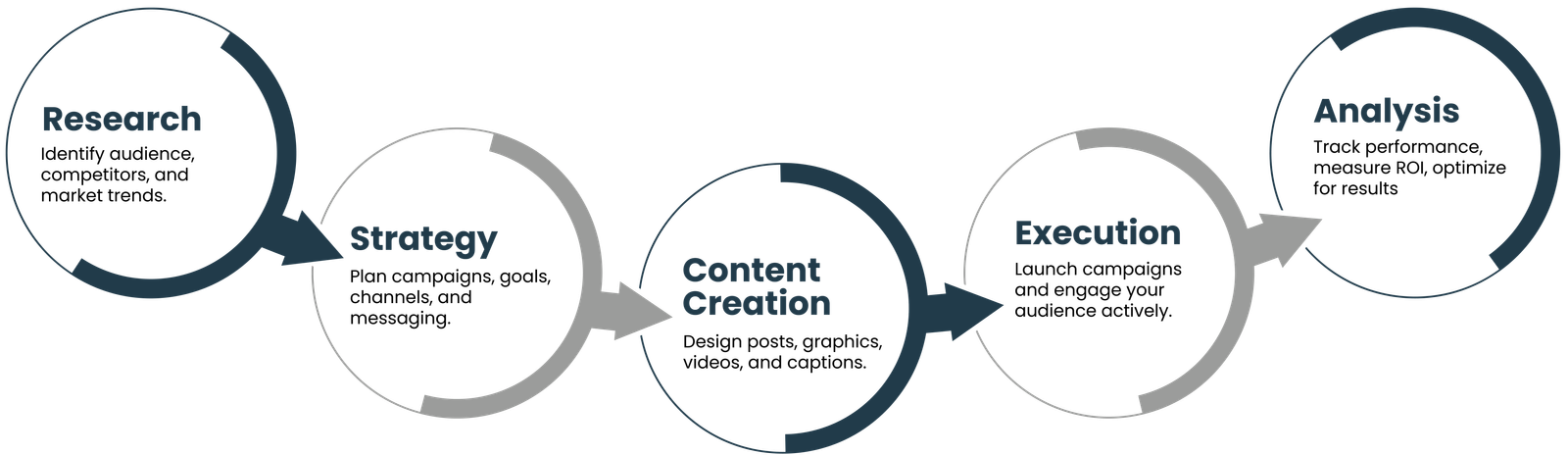 At TechWink, we follow a structured process from research and strategy to content creation, campaign management, and performance analysis—delivering engaging, results-driven social media campaigns that grow your audience, boost engagement, and drive measurable business results.